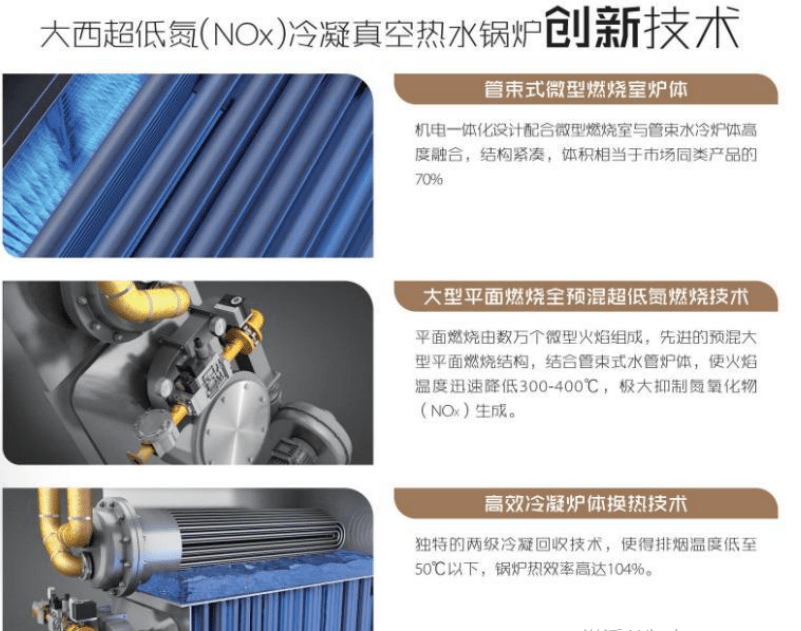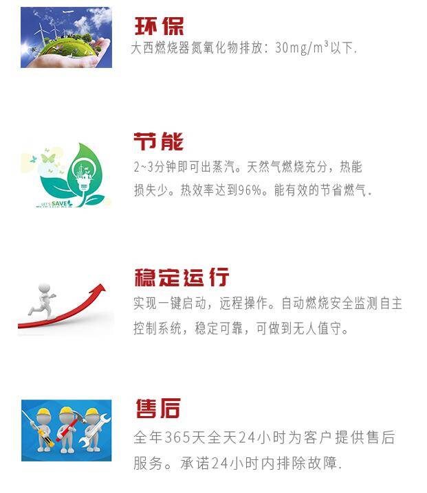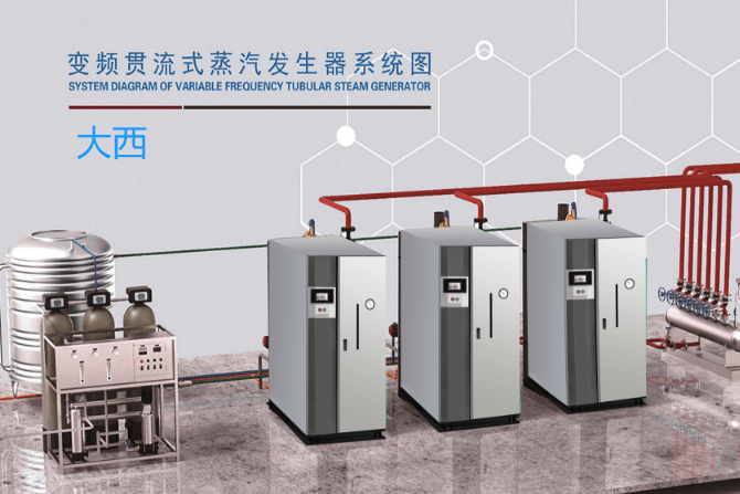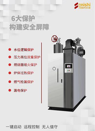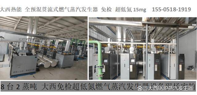 大西蒸汽发生器设备有0.5蒸吨、1蒸吨、1.5蒸吨、2蒸吨,支持多台并联,且设备体积小可方便就近安装或安装于楼顶或地下室等空间,智能化操作,蒸汽饱和度高、超低氮15mg,免检,不属特种设备。
